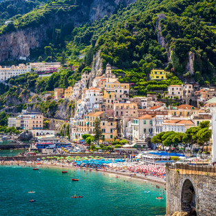 Once the capital of a maritime republic, Amalfi, with a Moorish feel, pairs its traditional gems with stunning sea views and an animated beach scene. Its cluster of white buildings effortlessly clinging to sheer cliffs overlooking the crystal clear waters below. Amalfi Town features a beautiful promenade and a marina filled with vibrant flags. Adorable cafés and shops litter the town and delight the senses. Realized with the Duomo di Sant'Andrea, the Museo Della Carta, and the Emerald Grotto, you'll find the city utterly fascinating.